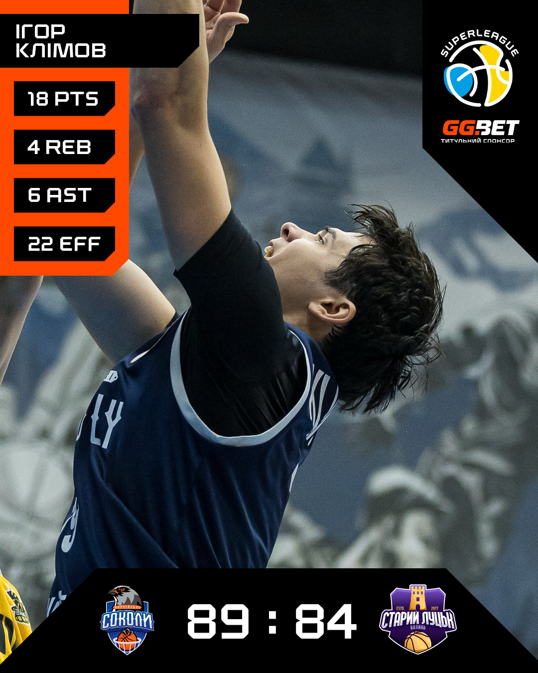 Соколи: Клімов 18 + 6 передач + 4 підбирання, Нікітін 16 + 5 підбирань, Соловйов 16, Хохоник 11 + 7 передач + 7 підбирань, Заплотинський 8 + 9 підбирань — старт, Максим Безима 8, Мартинов 6, Микита Безима 4, Клебан 2 + 5 підбирань