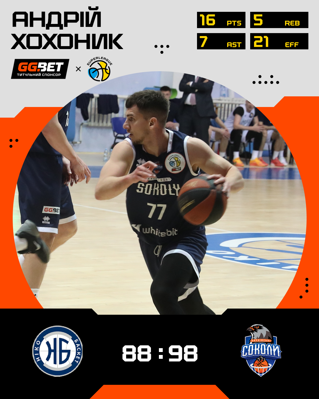 Найкращим гравцем матчу став Андрій Хохоник — у захисника Соколів 19 очок, 9 передач та 5 підбирань (РЕ 22) при 4 з 7 влучань з-за периметра. Саме відсоток реалізації триочкових харківʼян став ключовим фактором у цій грі — Соколи реалізували 15 з 27 кидків з-за дуги (55%).