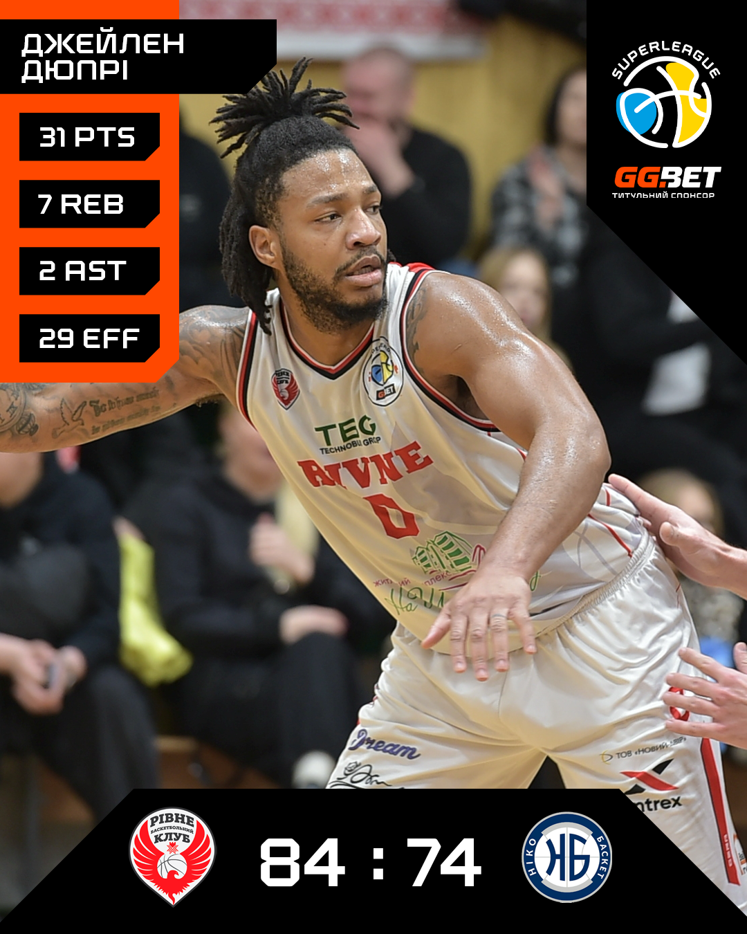 Рівне: Дюпрі 31 + 7 підбирань + 2 передачі, Трейлор 16, Биков 13, Браун 13 + 9 підбирань, Тимощук 5. — старт, Поносов 4, Коровяков 2, Шепелев 0, Рябой 0