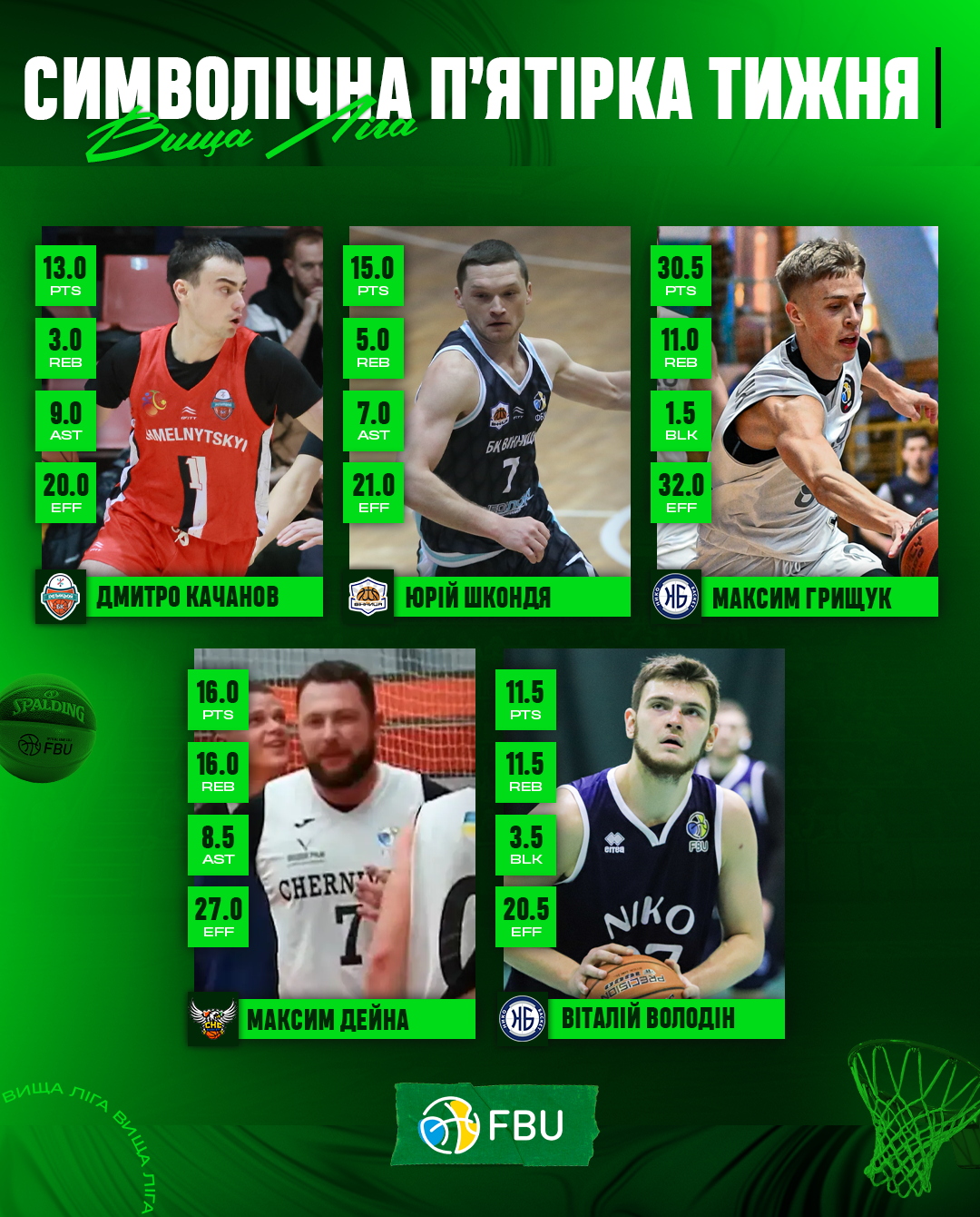 Максим Грищук (Ніко-Баскет-2) – 30.5 очка, 11.0 підбирання, 1.5 блок-шота. РЕ 32.0