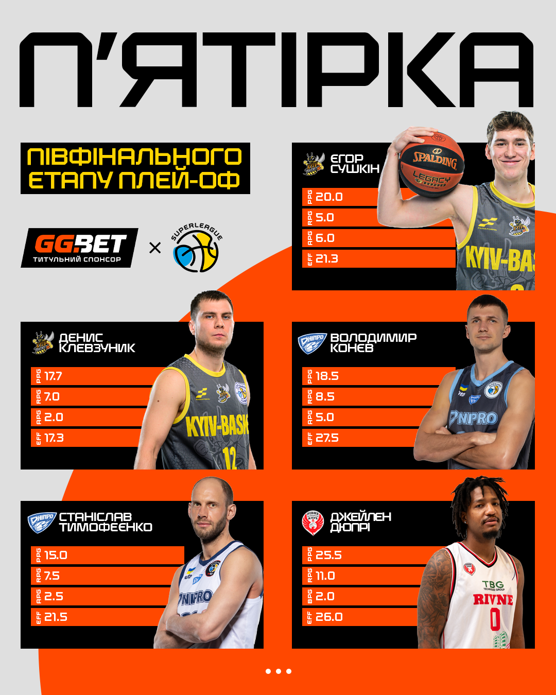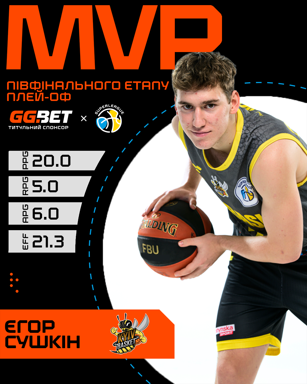Єгор Сушкін, Київ-Баскет (3 матчі) — 20.0 очка, 6.0 передачі, 5.0 підбирання (РЕ 21.3)