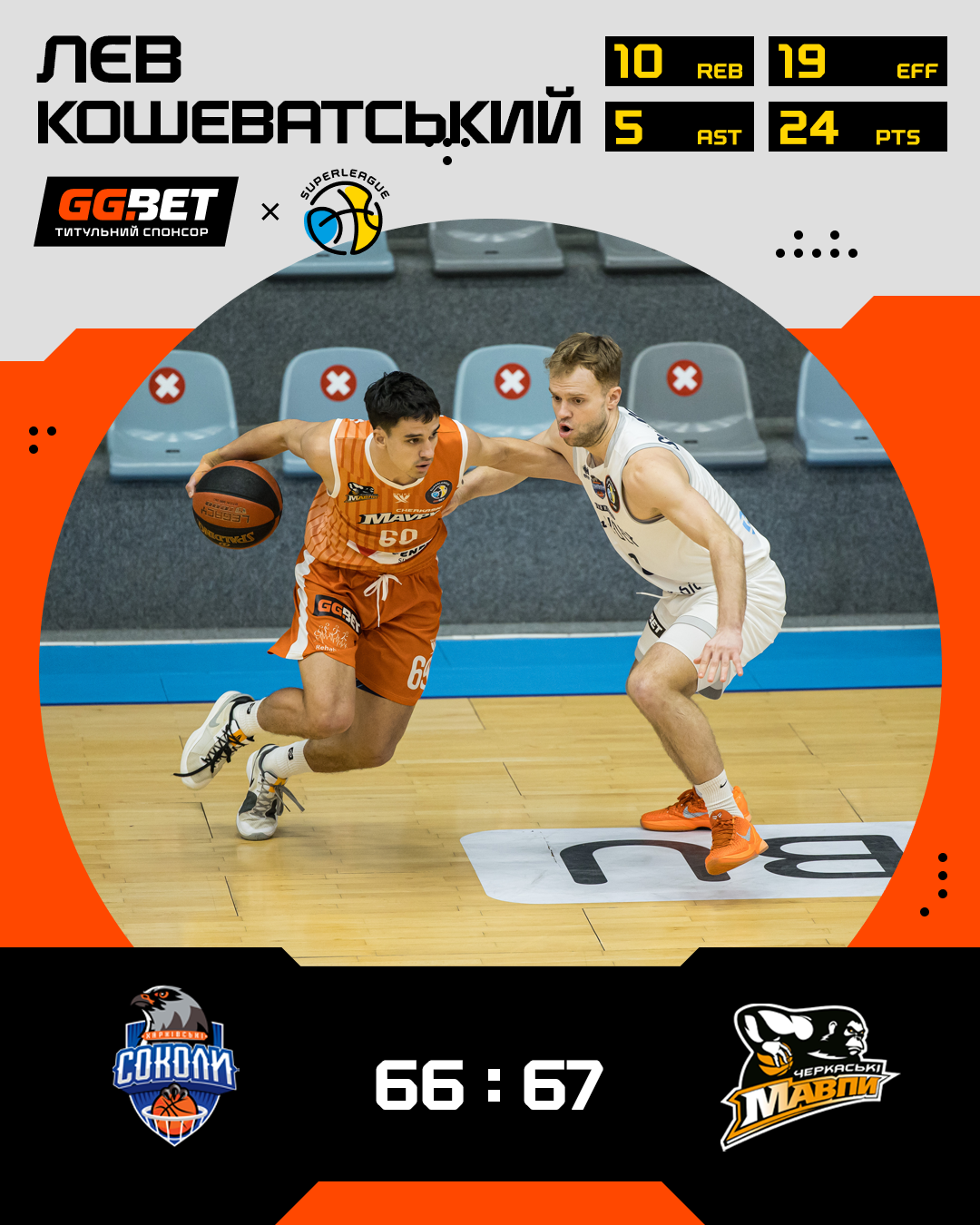 Найкращим у переможців став розігруючий Лєв Кошеватський, який до 24 очок додав 10 підбирань та 5 передач (РЕ 19). У Кирила Марченка 16 очок та 6 передач (РЕ 17). У Соколів 14 очок набрав Олексій Соловйов.