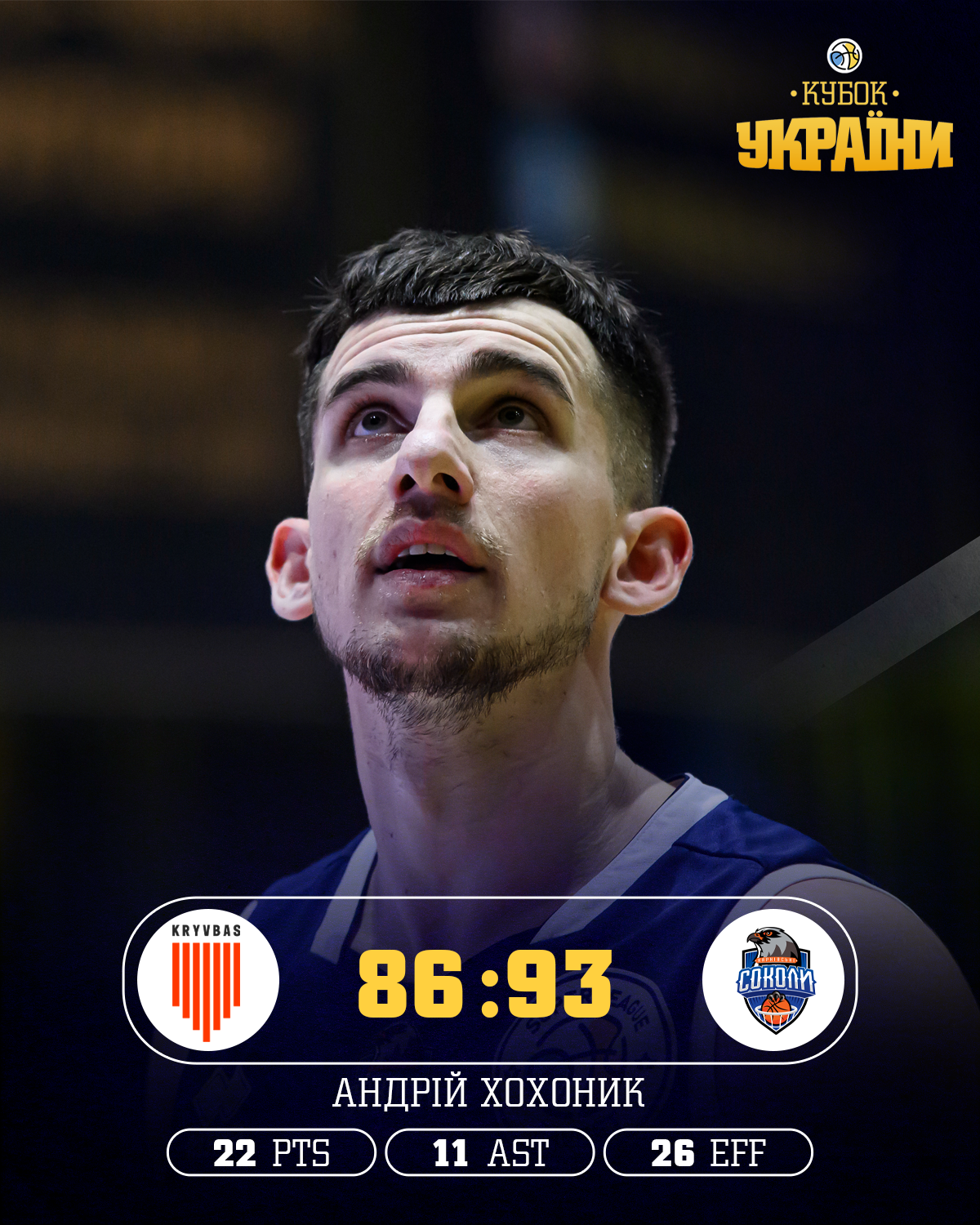 Соколи реалізували 33% триочкових (12/36), краще рухали м’яч та зробили на 10 втрат менше за суперника. У складі Кривбаса 29 очок набрав Мартін Хілл (РЕ 33), а у переможців 25 очок до активу записав Максим Нікітін, а Андрій Хохоник зробив дабл-дабл — 22 очки + 11 передач. 21 очко також приніс харківській команді Олексій Соловйов, який реалізував 4 триочкових.