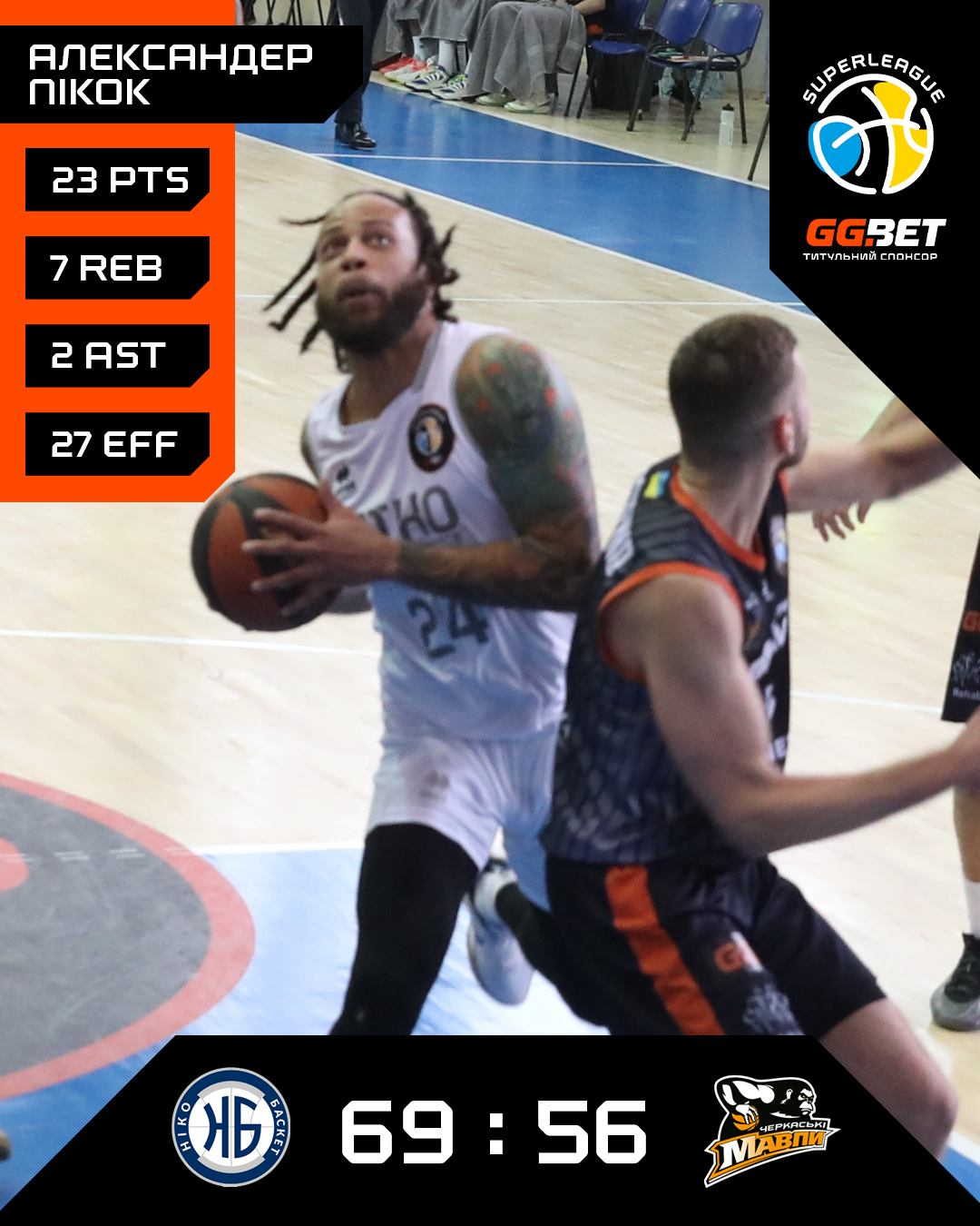 Ніко-Баскет: Пікок 23 + 7 підбирань + 6 перехоплень, Грищук 11, Сафонов 10, Лук’ян 6 + 6 підбирань + 3 передачі, Гарбар 4 — старт, молярі 7, Водолазський 4, Зайцев 4, Лихой 0, Кабанов 0