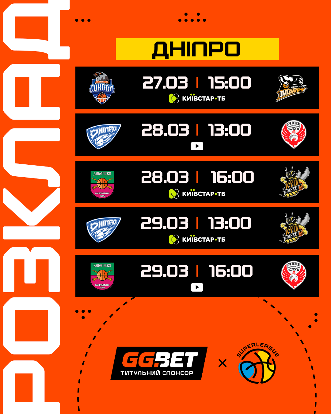 13:00 Дніпро – Київ-Баскет (Київстар ТБ)