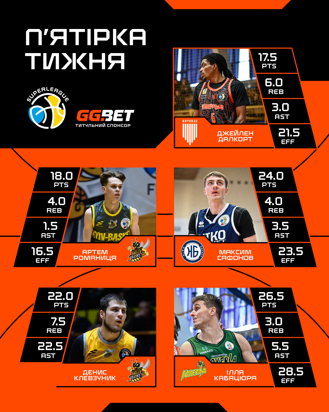 Ілля Кабацюра (Прикарпаття-Говерла) — 26.5 очка, 5.5 передачі, 3.0 підбирання (РЕ 28.5)