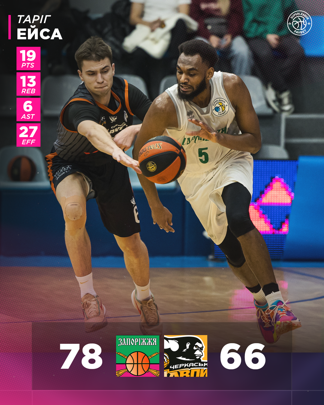 У Запоріжжя дабл-дабл оформив Таріг Ейса з 19 очками і 13 підбираннями, до яких додав 6 передач, а у Антона Буца 16 очок і 8 підбирань. У Черкаських Мавп найрезультативнішим з 14 очками став Даніїл Пирогов.
